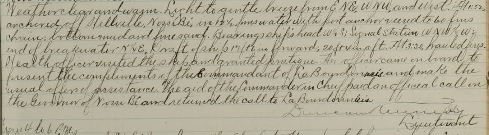 The logs are typically full of weather reports and sailing data. However, there are also mentions of other ships coming into port (a French and US ship on the 24th). Dignitaries from Nossi Be and other ships came on board and were honored and officers left the ship to attend other functions as well. One sailor came to the end of his enlistment at this port and was discharged and a few punishments for fighting and other unwanted behaviors were meted out.