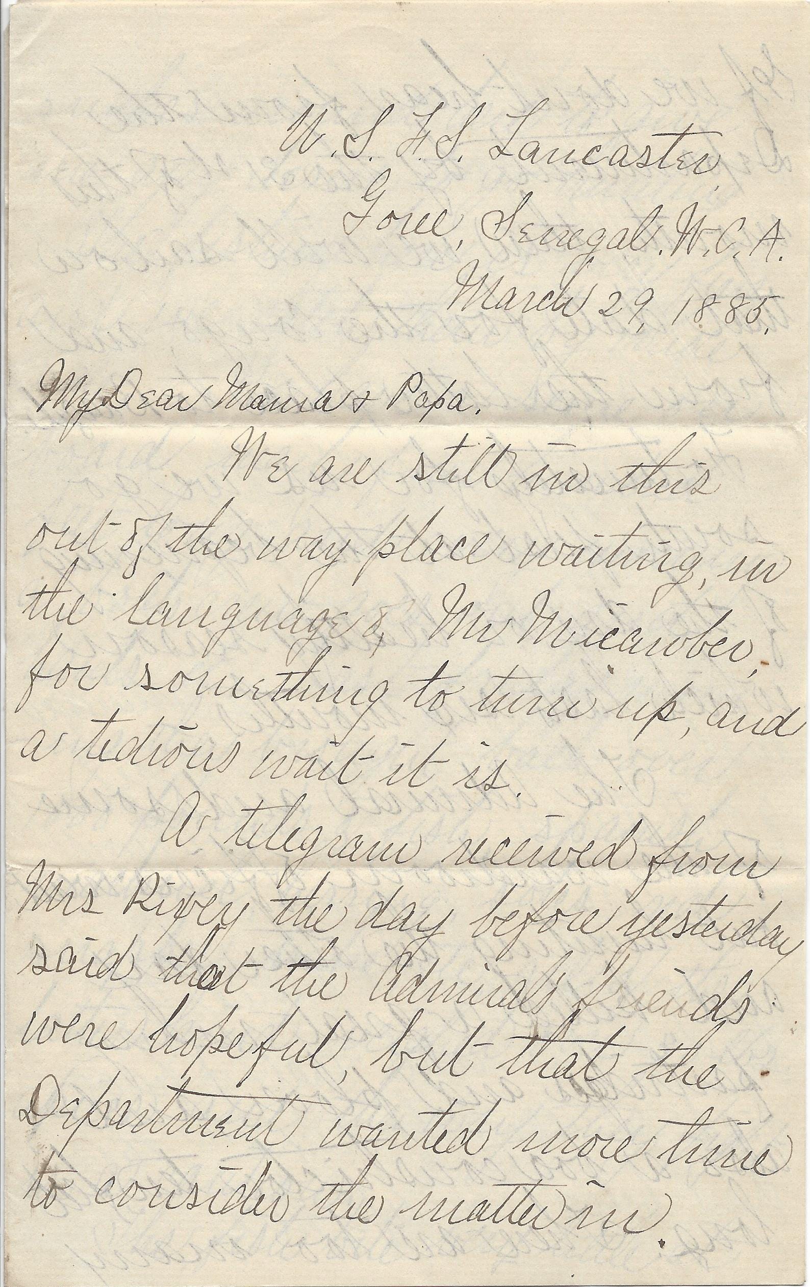 The log book has a notation that the Messagerie Maritime Steamer (MMS) Niger departed the port at Dakar on March 28. Because our letter writer does not mention it, we can ascertain that this was an outbound ship. And, we can probably deduce that it was normal for these mail ships to traverse from Bordeaux to Dakar in about eight days.